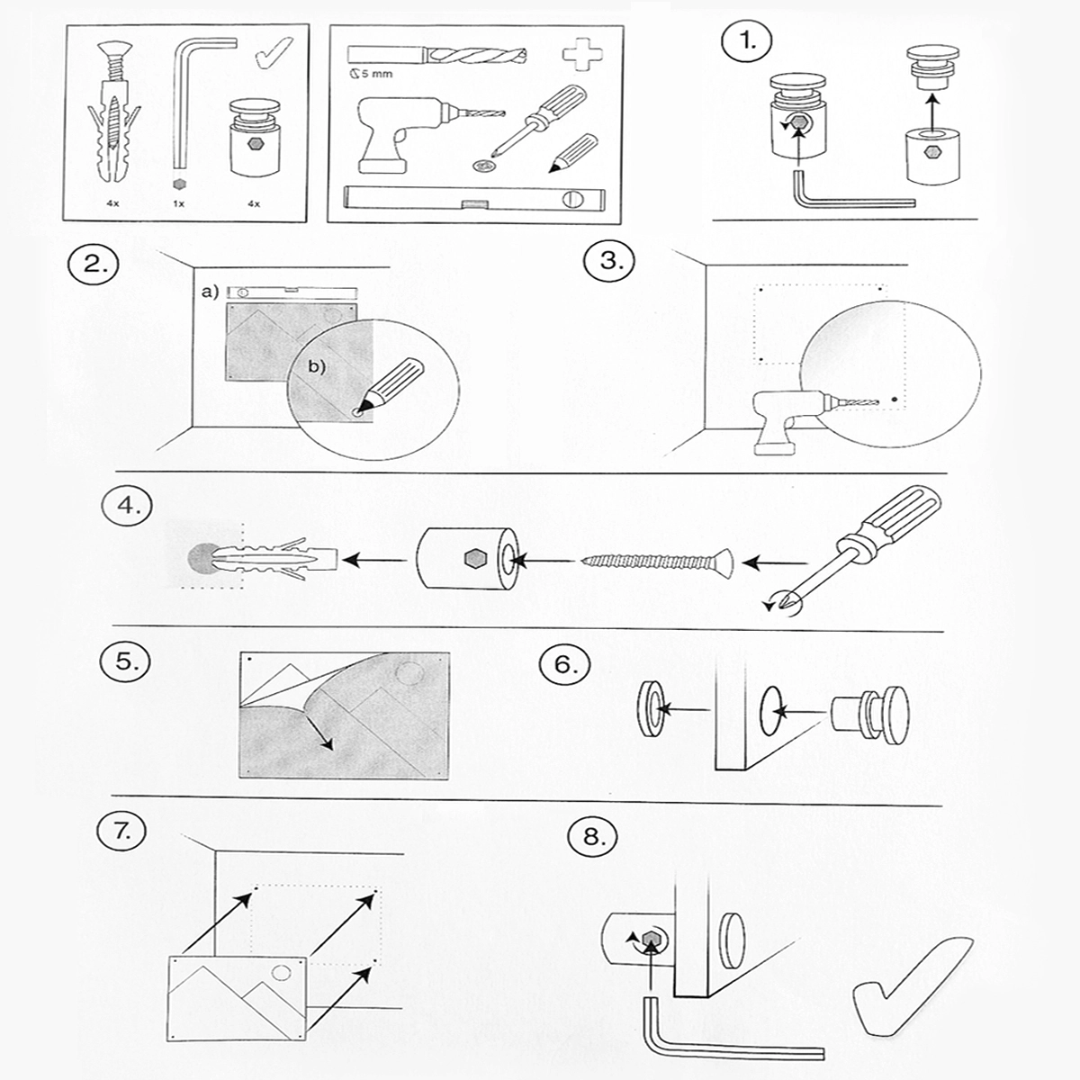• We include hanging hardware with screws for easy installation. With a screw hole in each corner, regardless of format, the center of the hole is positioned approximately 14mm /0.55″ from each edge in each corner. The screw hole diameter is 8mm /0.31″, and the diameter of the head of the screw is 15mm /0.6″.